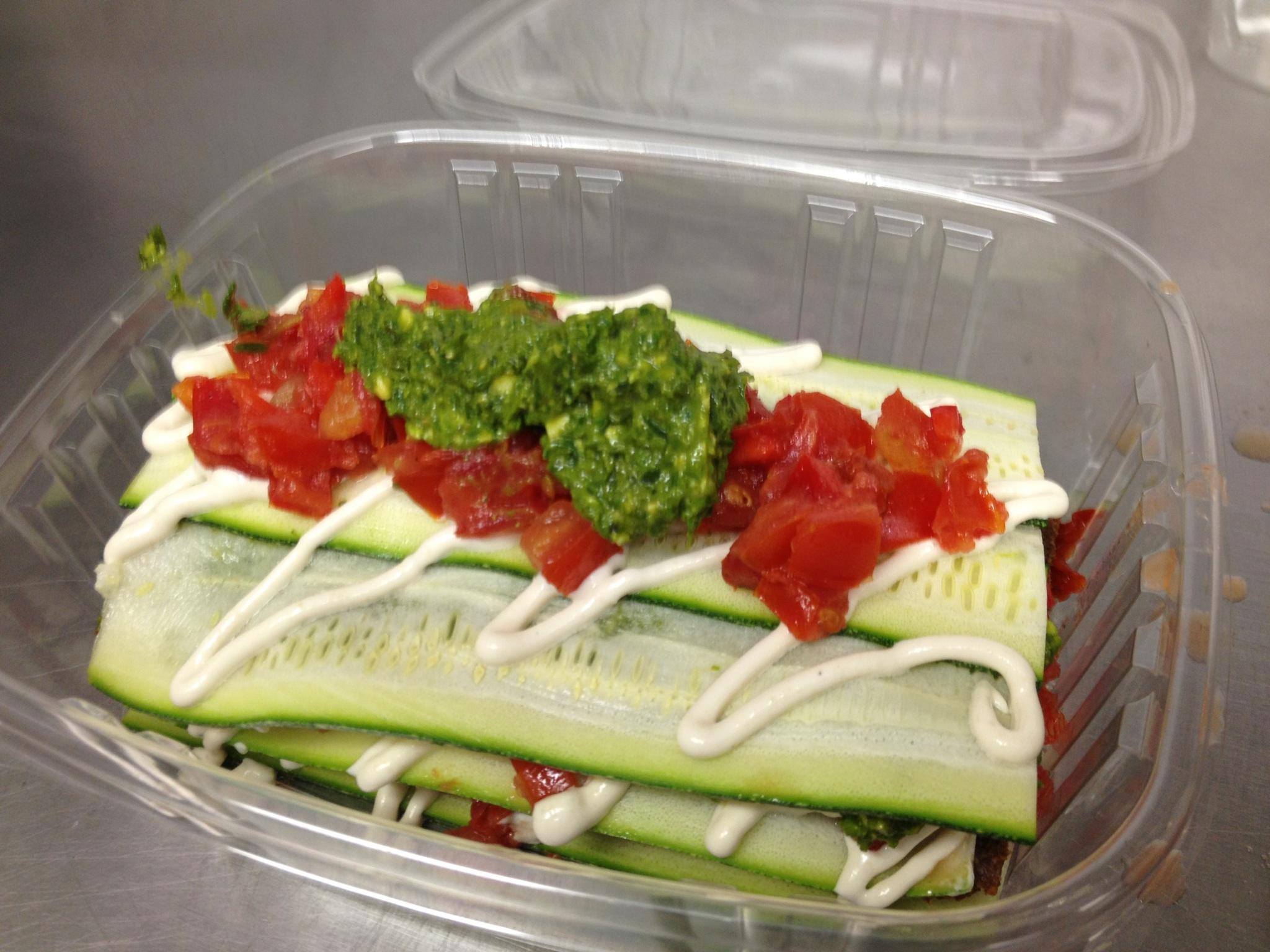 Get a mold and put down a layer of zucchini. Add a layer of marinara. Add some walnut meat, pesto, cashew cheese, baby spinach (optional), and then add another layer of zucchini and repeat until you have 3-4 layers.